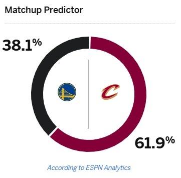 ESPN预测本场比赛,勇士胜率仅38.1%,骑士胜率为61.9%。