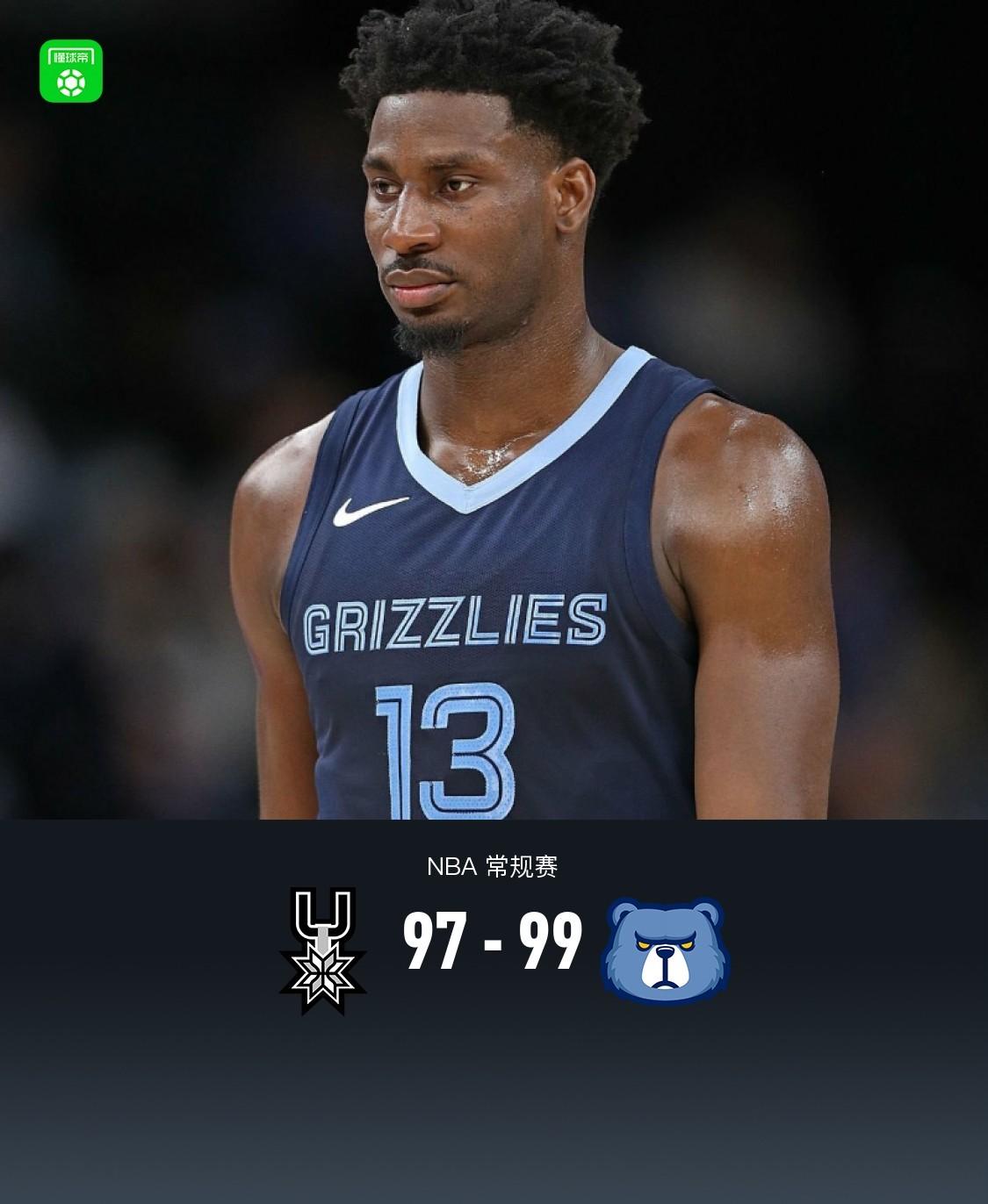 第四节马刺特雷-琼斯拿下11分,灰熊小贾伦-杰克逊拿下12分,最终马刺97-99不敌灰熊