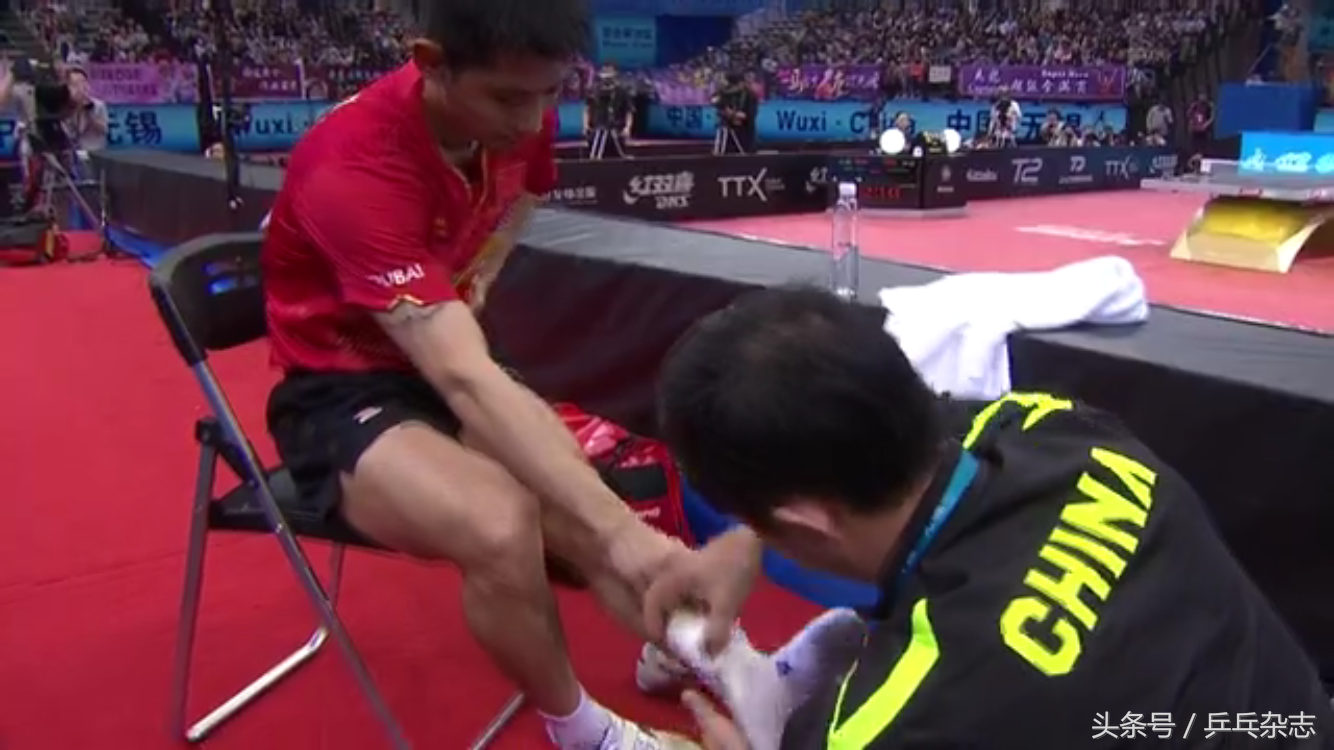 局间张继科因为脚部伤病,申请医疗暂停,在现场对脚伤进行喷雾处理后,张继科坚持回到场上继续比赛,第四局比赛的张继科明显受到脚部影响,遗憾以7:11输掉。比赛拖入决胜局的比拼,张继科在开局3:5落后情况下顽强将比分反超至6:5,此时林高远叫了暂停,再度上场后的张继科最终以11:7赢下本场比赛。其坚持拼搏的精神更是感动现场所有球迷。