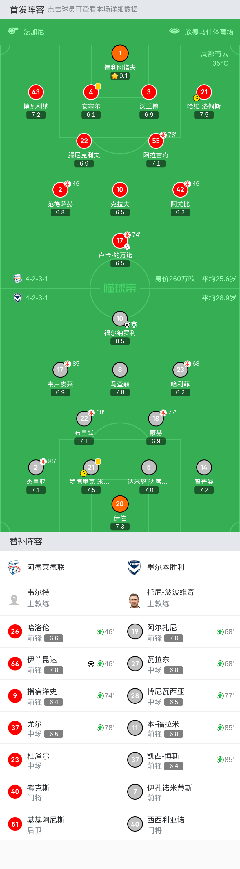 阿德莱德联 首发:21-哈维-洛佩斯, 22-滕尼克利夫, 4-安塞尔, 10-克拉夫, 3-沃兰德, 1-德利阿诺夫, 2-范德萨赫, 55-阿拉吉奇, 17-卢卡-约万诺维奇, 42-阿尤比, 43-博瓦利纳