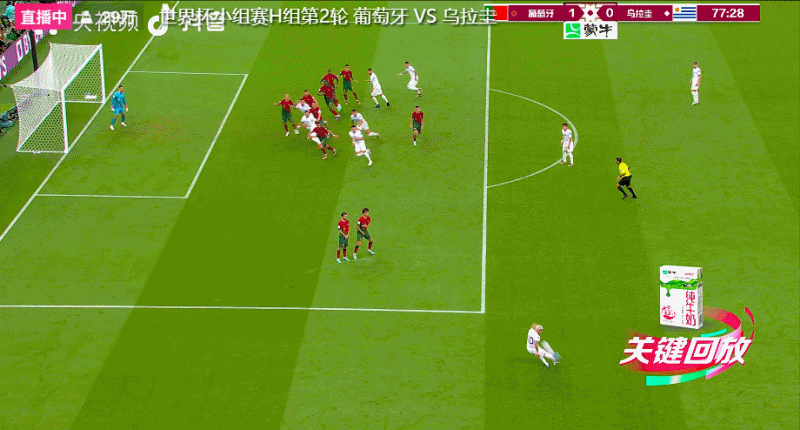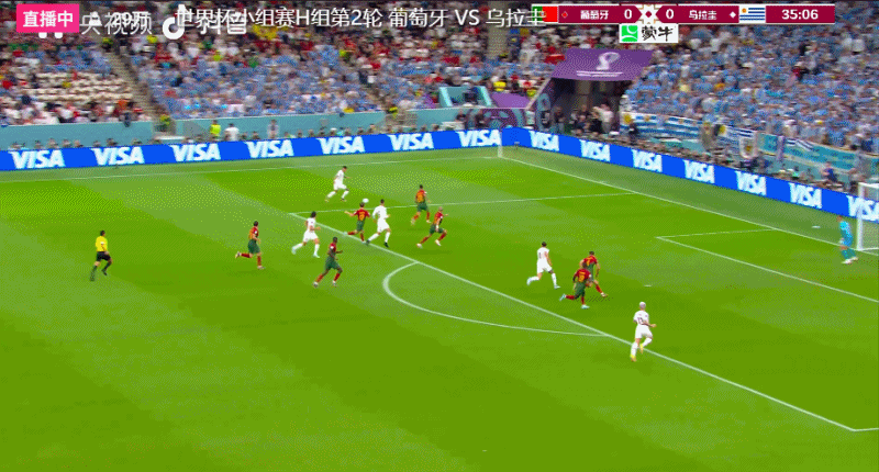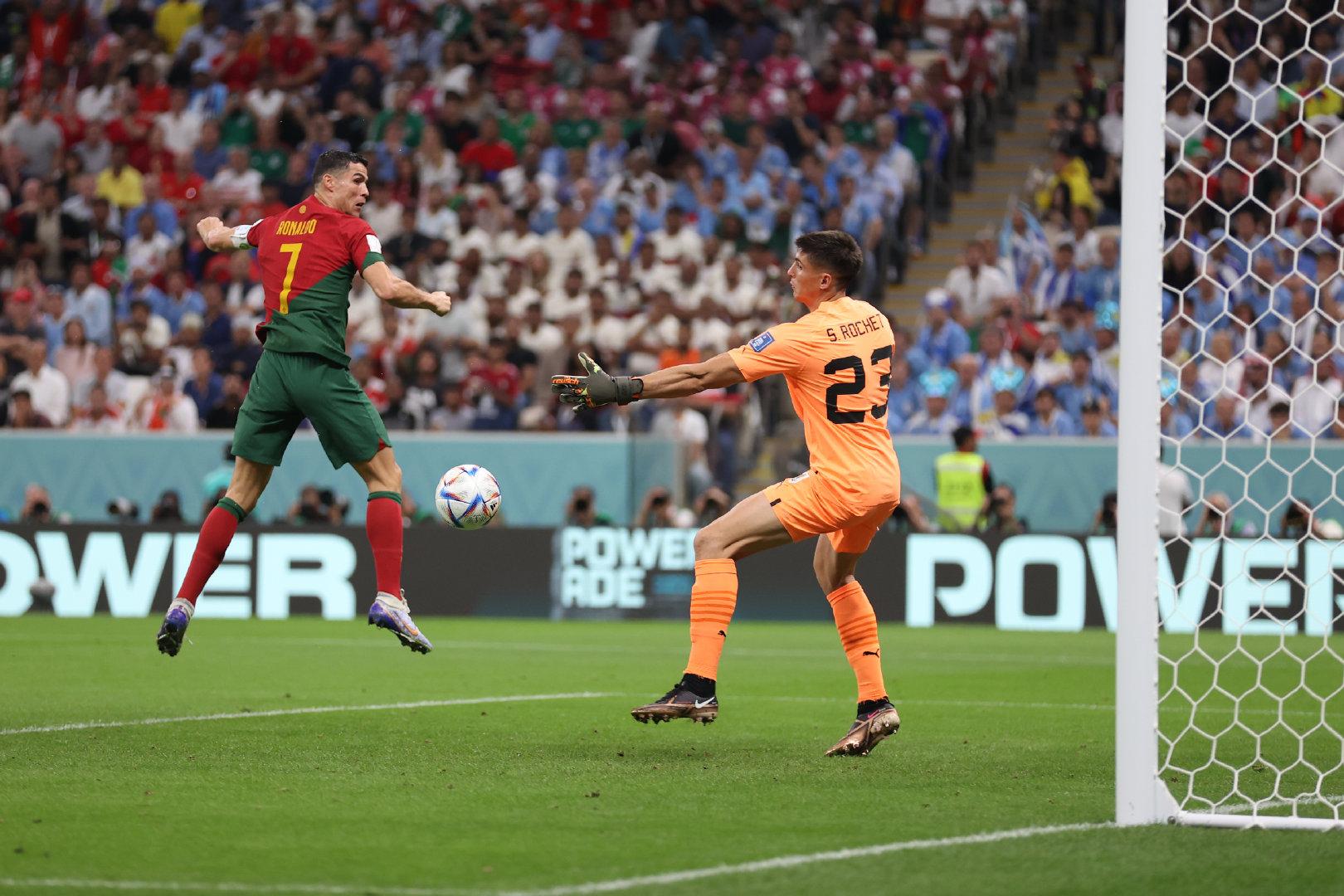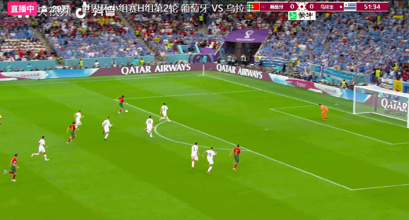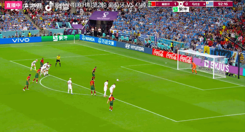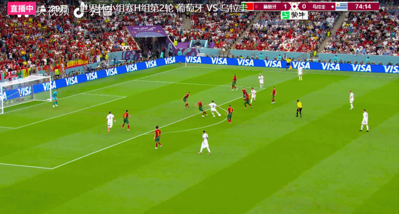 第54分钟,B费在前场左侧拿球传中,禁区内的C罗前插头球攻门似乎没碰到球,但也晃了一下罗切特,皮球飞入球门,葡萄牙队1-0领先乌拉圭队。领先之后,C罗疯狂庆祝。世界杯官方先是将这个球算在C罗名下,但随后又进行更改,将这个进球算在了B费的帐下。