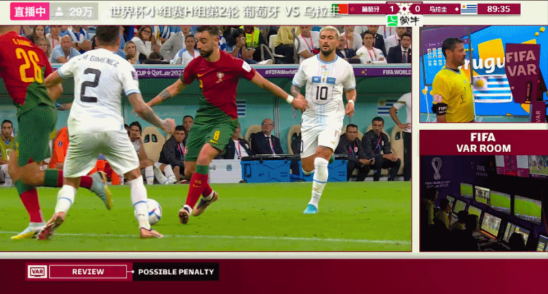 第82分钟,C罗和费利克斯同时被换下。第86分钟,B费带球突入禁区,穿裆过掉希门尼斯,后者倒地时手球犯规。裁判到场边观看VAR后给了葡萄牙队一个点球。