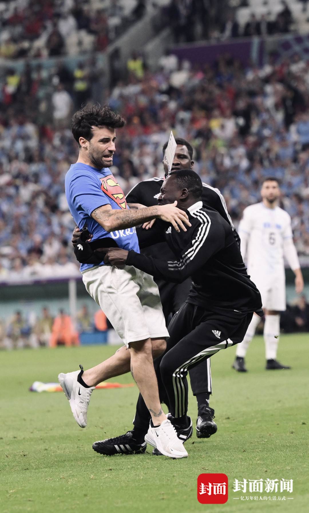 比赛中途有球迷冲入场内被安保人员制服