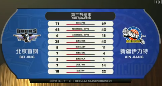 第三节双方你来我往,比分一直没拉开,到了第四节上半段北京打的不好,换下林书豪换上新来的大外援有所起色,但新疆关键的时候国内球员曾玲旭命中3分新疆领先4分,比赛只剩下十几秒,翟小川快速的3分,比分还差一分,新疆进攻不成,北京叫暂停布置最后一攻,结果北京队未能打进,新疆客场以1分的优势赢下比赛。