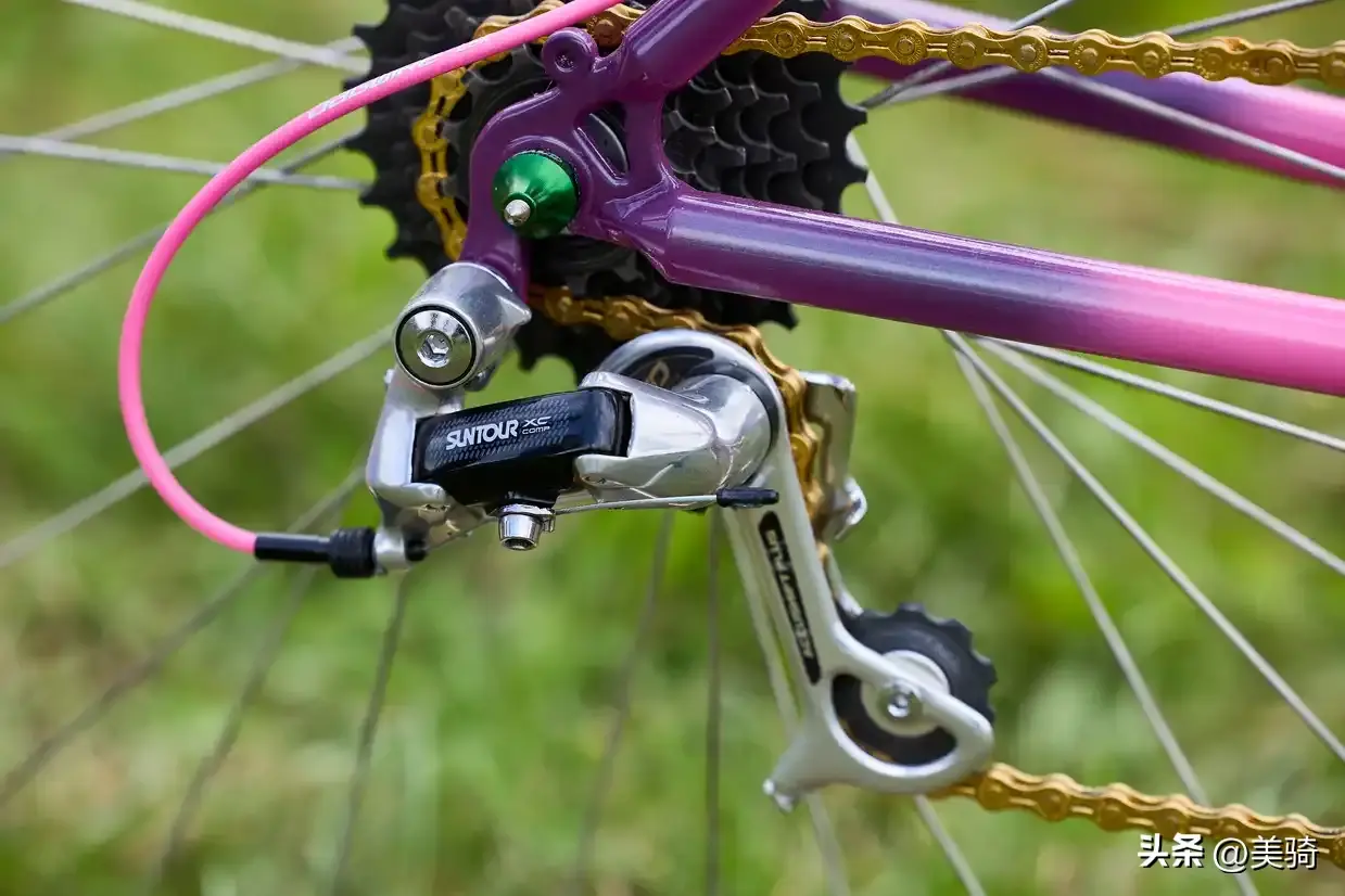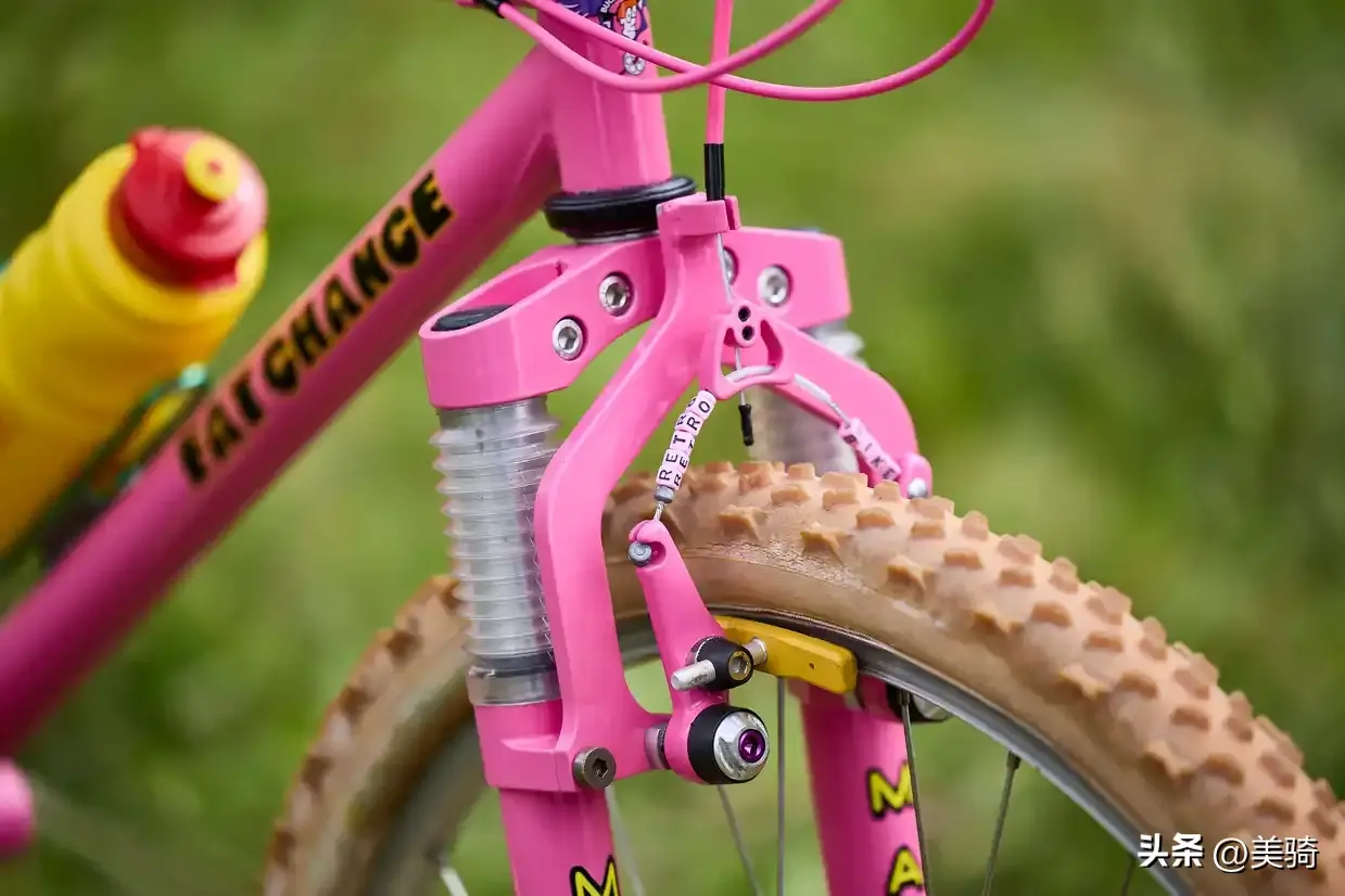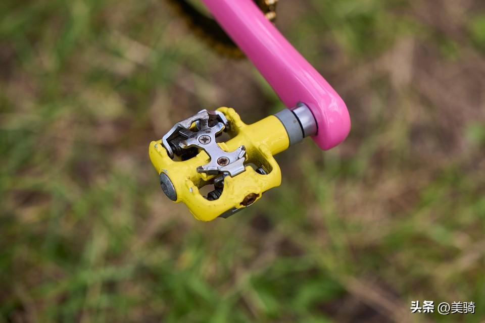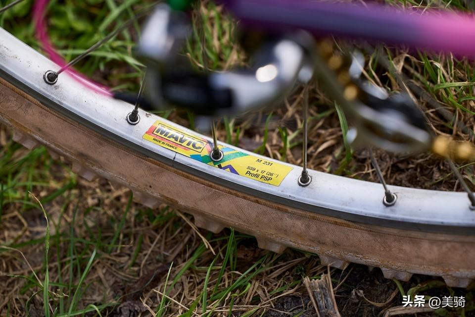 Mavic M231轮圈与一些同样过时的外胎结合在一起,而骰子形状的防尘盖和定制的闪亮夹器一同完成了这粉红色的主题。