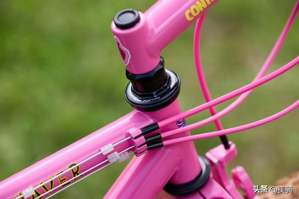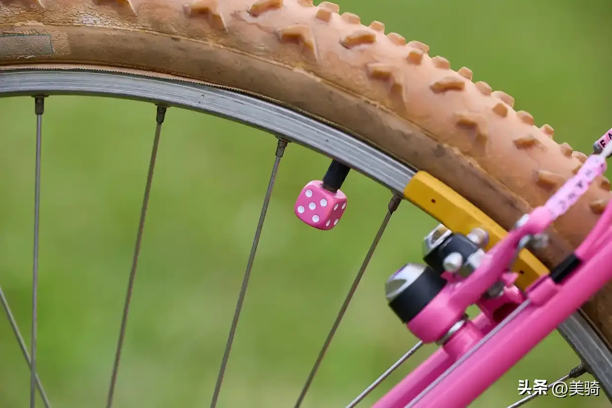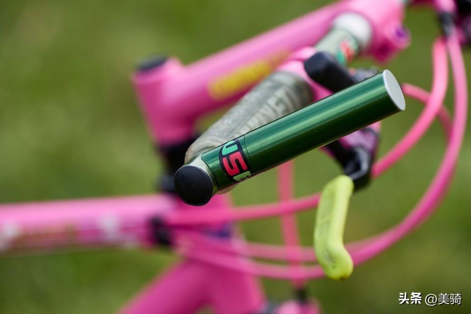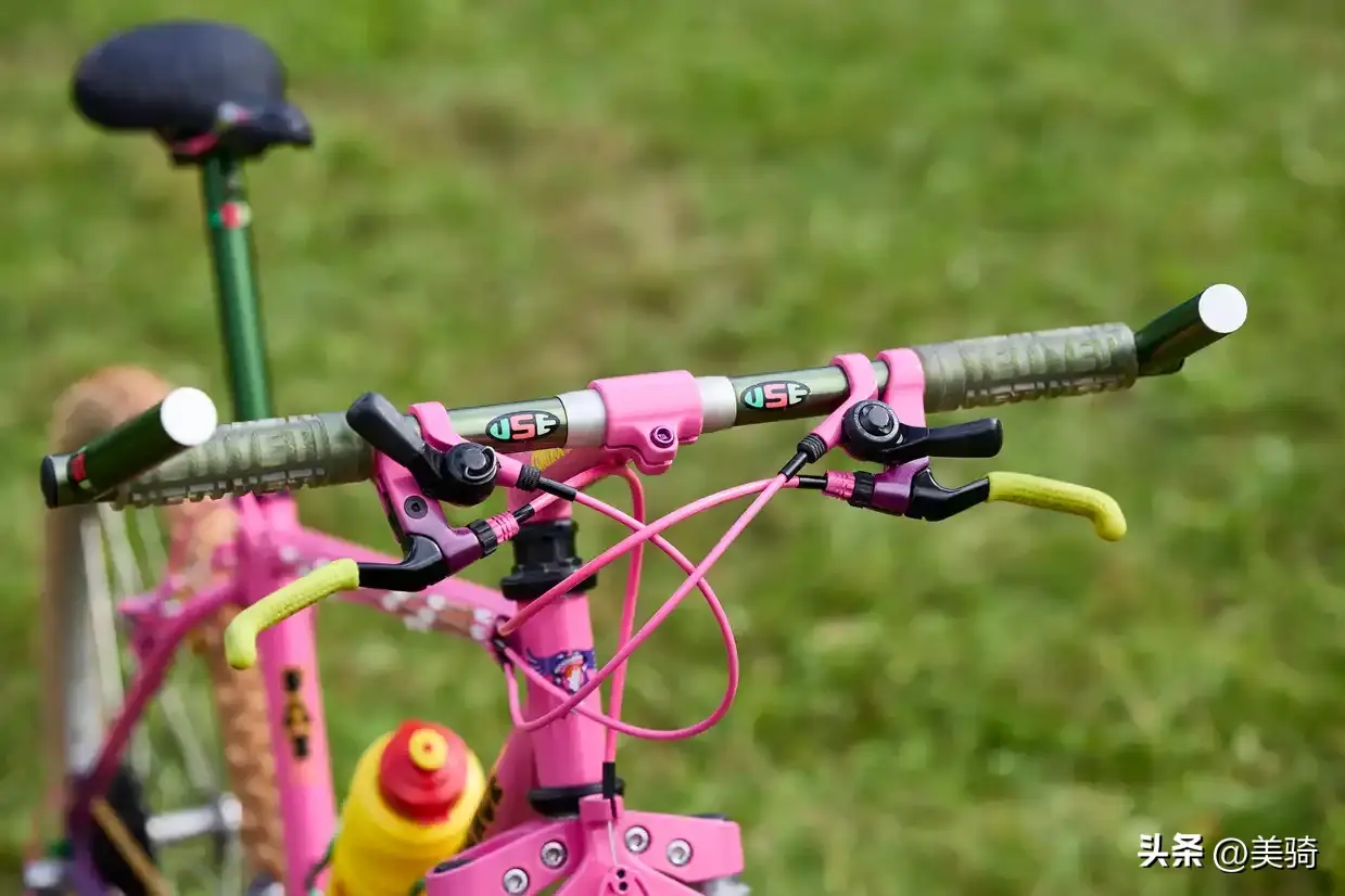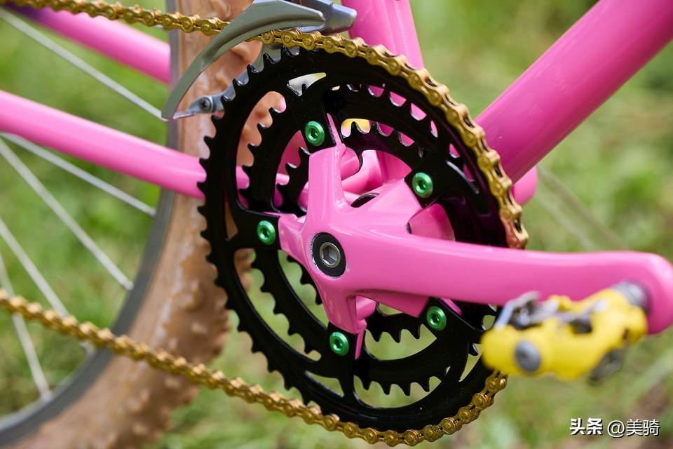Mavic M231轮圈与一些同样过时的外胎结合在一起,而骰子形状的防尘盖和定制的闪亮夹器一同完成了这粉红色的主题。
