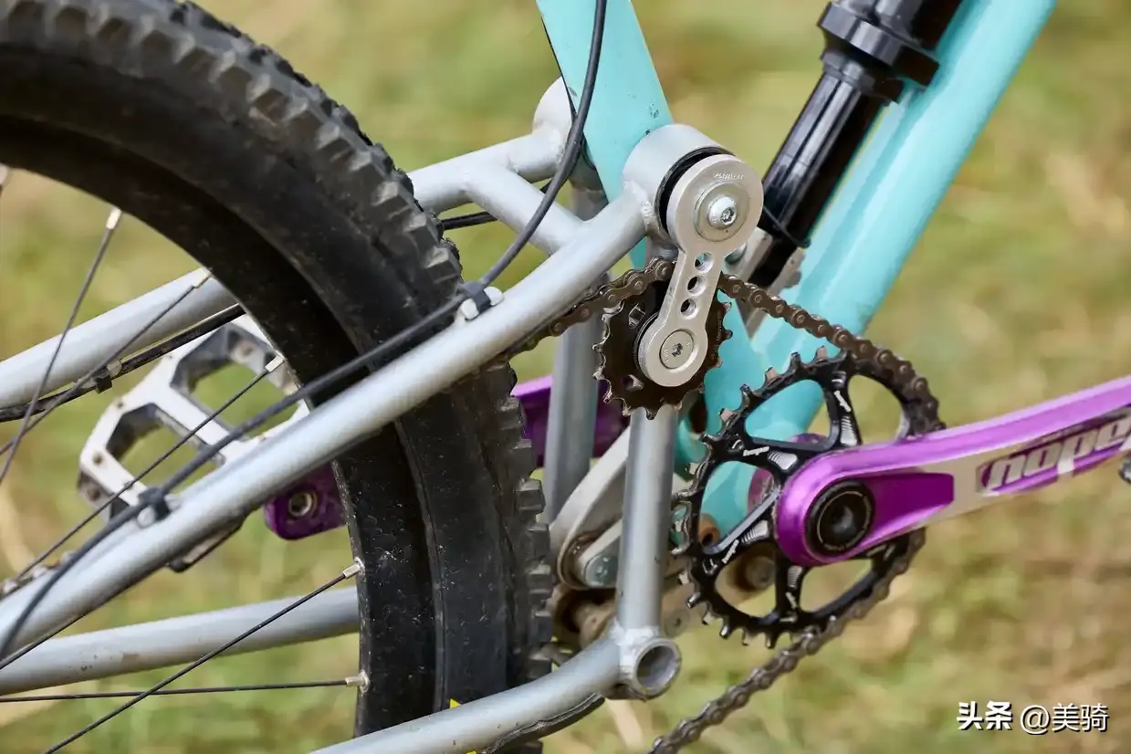 该车配备了一系列紫色氧化的Hope组件,其中刹车、碟片、碗组、轮组和曲柄均由Hope提供。Hope的Fortus 30轮组搭配Maxxis High Roller II轮胎,避震系统则是由Marzocchi的BomberZ1前叉和Bomber Air后胆来提供。