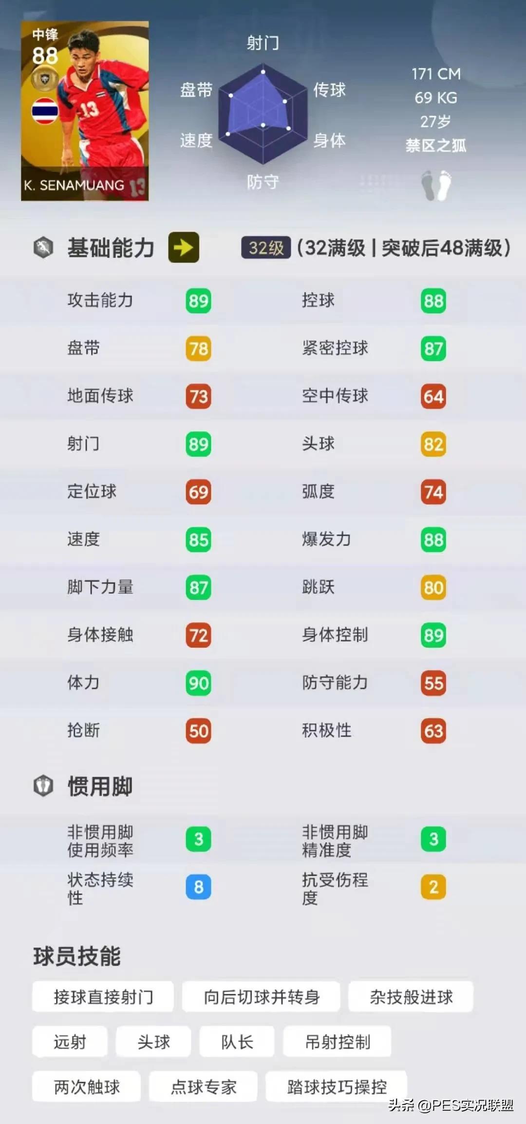 作为模型矮小的禁区之狐,塞纳芒的关键属性在传奇中并不突出,在游戏中也算不上热门球员。但他的好处是自身状态持续性8,并且拥有固定的B状态。