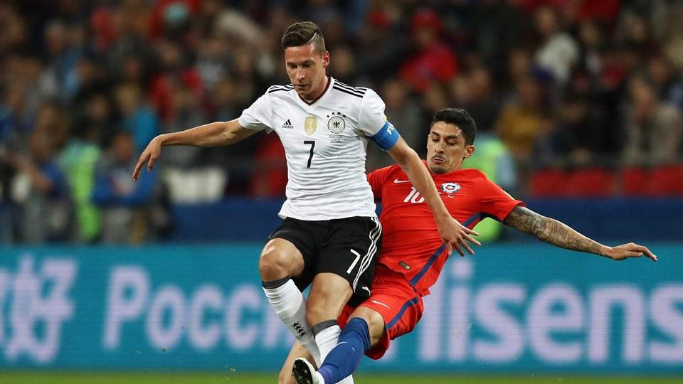 今晚(北京时间3日凌晨2点),2017年联合会杯将迎来最后一场比赛:德国Vs智利,谁能笑到最后捧起冠军奖杯呢?之前的小组赛中,两队打成1∶1平(图为拼抢中的德国队长德拉克斯勒和智利前锋巴勃罗)。过了今晚,就等于正式进入2018年俄罗斯世界杯时间,揭幕战将于明年6月14日打响。