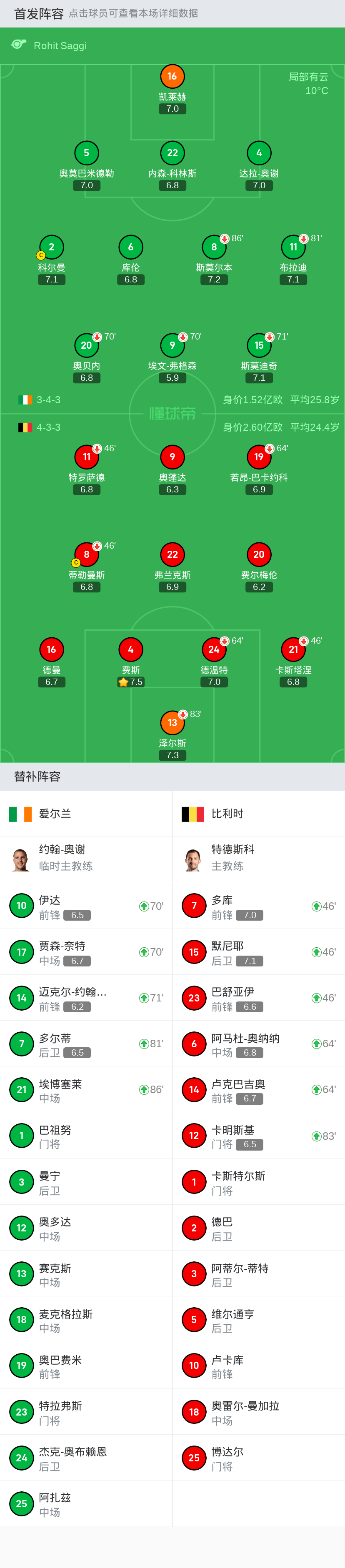 爱尔兰 首发:2-科尔曼, 11-布拉迪, 15-斯莫迪奇, 16-凯莱赫, 6-库伦, 20-奥贝内, 4-达拉-奥谢, 8-斯莫尔本, 5-奥莫巴米德勒, 22-内森-科林斯, 9-埃文-弗格森
