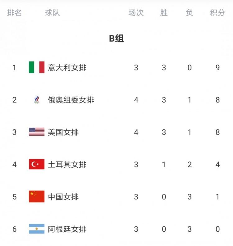 此前B组三场小组赛过后,美国队3战全胜积8分,和同组的意大利提前锁定了两个8强资格。俄罗斯女排3比2逆转中国队之后,成绩为2胜1负,积5分暂列小组第3,握有出线主动权;土耳其目前积4分,本轮她们将对阿根廷,取得3分基本手拿把攥。对于只有1个积分且胜负局为-7的中国女排而言,形势非常严峻,甚至可以说已经到了岌岌可危的关头。