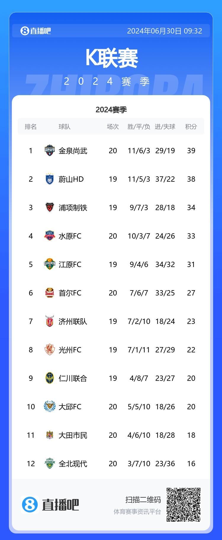 直播吧6月30日讯 在昨天结束的K联赛第20轮比赛中,全北现代在主场1-5不敌首尔FC,最新排名已经跌到积分榜末位,深陷降级区。