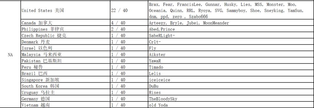 其它赛区或多或少都有外援的加盟,而唯一一个出现从别的大陆不远千里来抢肉吃的情况的赛区是北美。正如大家之前常玩的一个梗——“美国俱乐部EG由加拿大一号位、菲律宾二号位、新加坡三号位、丹麦四号位和以色列五号位组成”——所说的那样,有2支从海选一路杀入S级联赛的队伍北美人少于外援(注:因为凑不齐8支直邀定级赛的队伍,北美赛区的定级赛中有4支队伍来自海选,这意味着北美赛区是唯一一个可以通过海选直达S级联赛的赛区)。这个赛区共有14名选手来自于北美之外的国家,而这14名选手又分属13个国家。确实,北美DOTA的凋零给了不少其他赛区选手逐梦的机会,而在北美又没有那么严重的语言问题。这个情况,多少有点让人想起了当年的淘金热。