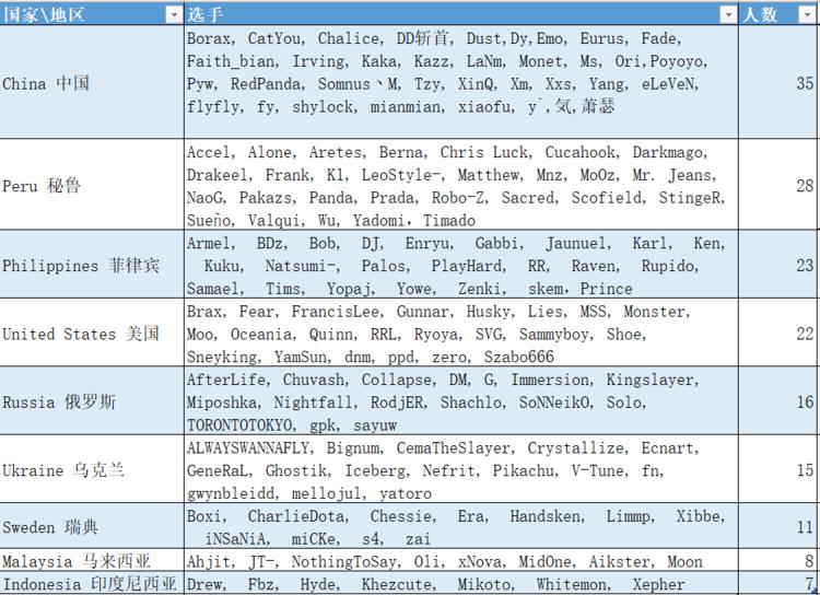 第一个问题当然是哪国贡献了最多的S级联赛选手。这个问题的答案是毋庸置疑的,作为唯一一个自成赛区的国家,共有35名S级联赛参赛选手来自中国。而第二名是哪个国家呢?这个问题的答案有些意料之外却情理之中——秘鲁。提起这个国家,想必所有有过美服游戏经历的玩家们都已经开始流冷汗了。ajajaja所到之处,整蛊操作数不胜数。不过秘鲁人的DOTA热情是不容置疑的,他们是南美赛区的核心力量。南美赛区有27位选手来自秘鲁,其中最为我们所熟知的当属K1大神。