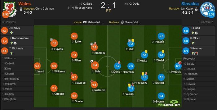 威尔士前场攻击群表现良好,贝尔获得全场最佳,门线救险的本-戴维斯也获得好评。斯洛伐克方面哈姆西克得分最高,替补球员也有亮眼表现,但锋线令人失望。
