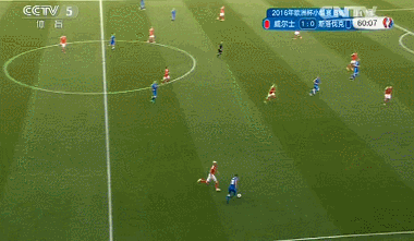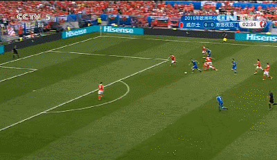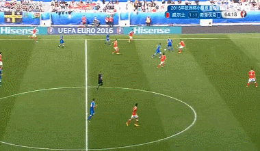 开局阶段双方拼抢积极,第7分钟,拉姆塞开出任意球,门前混战中皮球被科扎奇克击出。第10分钟,威尔士获得位置绝佳任意球,贝尔操刀主罚,皮球绕过人墙骗过门将直接飞入球网,1-0!