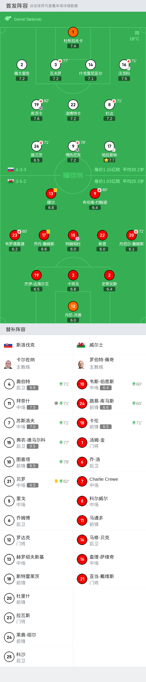 斯洛伐克(4-5-1):23-科扎奇克/18-斯文托、4-杜里卡、3-斯科特尔、2-佩卡里克/19-库茨卡、13-赫鲁索夫斯基(60'8-杜达)、7-维斯(84'10-施托赫)、17-哈姆西克、20-马克/21-久里什(60'11-内梅克)