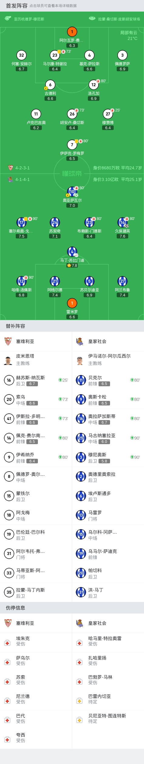 北京时间11月4日西班牙足球甲级联赛联赛第12轮,塞维利亚主场对阵皇家社会。