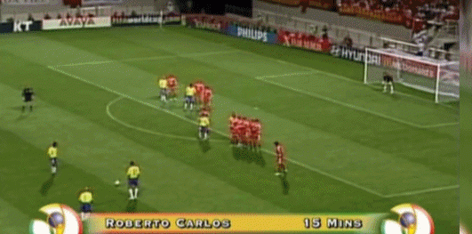 第15分钟,罗伯特卡洛斯打入世界杯历史上球速最快的任意球。