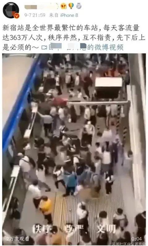 9月7日晚,微博粉丝超24万的博主A发布了一段时长仅4秒的视频,称视频里的地铁站是位于日本东京的新宿站。“新宿站是全世界最繁忙的车站,每天客流量达363万人次,秩序井然,互不指责,先下后上是必须的。”博主A写道。