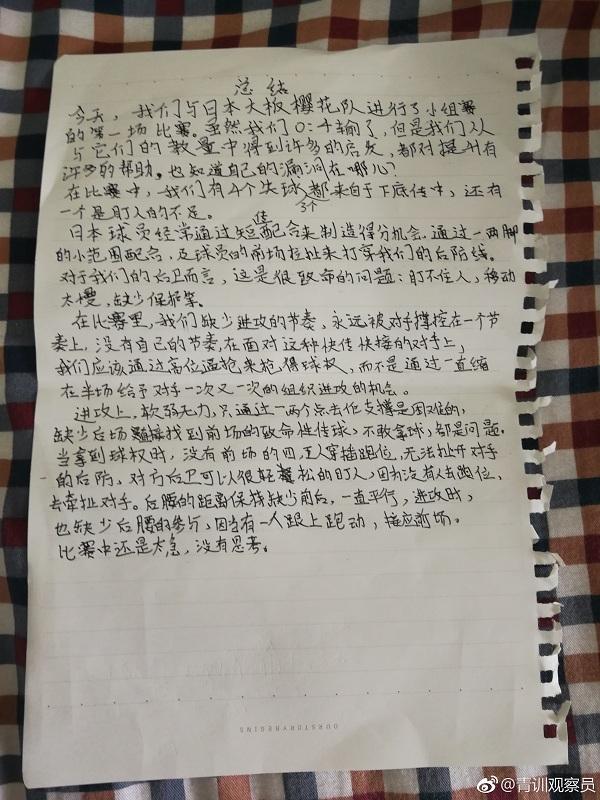 一名申花小球员所写的赛后总结。