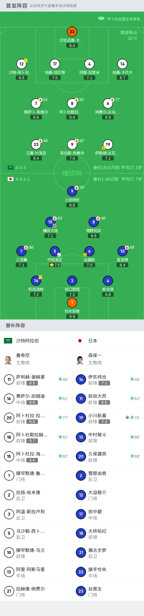 沙特出场阵容:22-阿尔卡萨尔、17-坦巴克蒂、4-奥贾米、14-哈桑、12-阿卜杜勒哈米德、23-叶海亚(46’11-谢赫里)、8-马尔基(82’15-哈巴利)、6-多萨里(77’20-拉蒂夫)、7-穆萨布(61’16-加姆迪)、19-多萨里、9-布赖坎(82’18-加里卜)