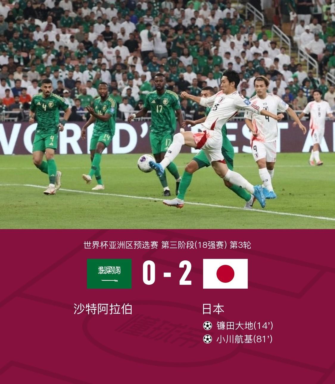日本2球领先!第81分钟,伊东纯也主罚角球开出落点精准,替补登场的小川航基高高跃起抢点头球破门,沙特0-2日本!↓