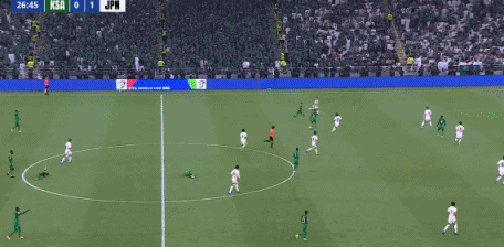 第27分钟,沙特发动攻势,禁区线连续三脚射门均被日本多名球员合力封堵。↓