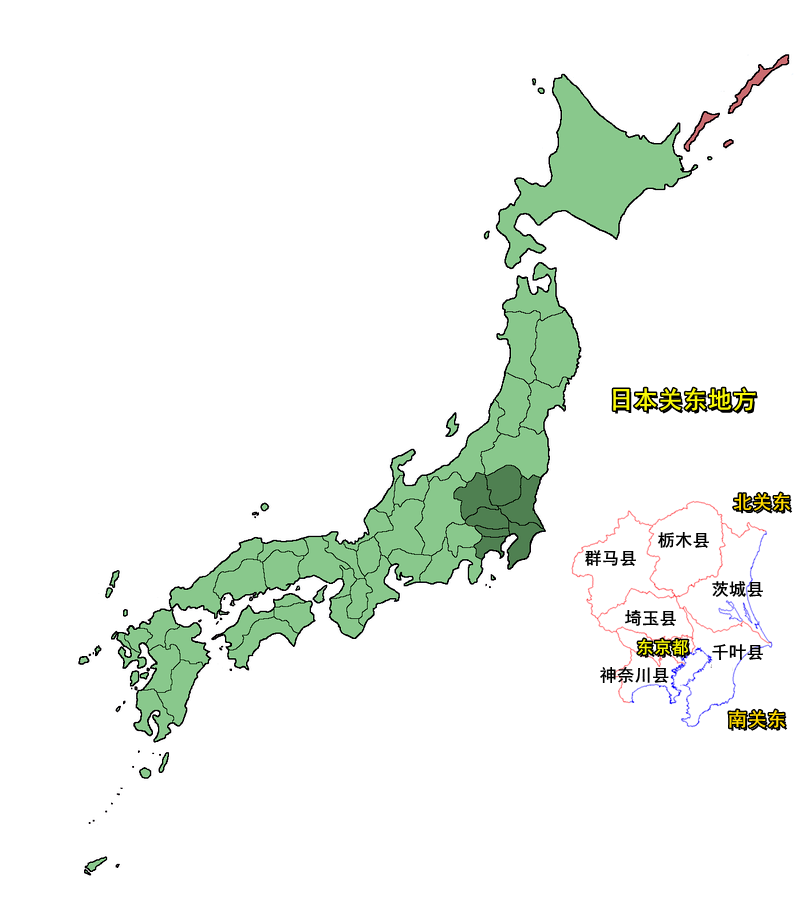 东京都、神奈川县、千叶县、埼玉县这一都三县在日本被称为南关东,而茨城县、栃木县、群马县这三县则被称为北关东,以上这些行政区域构成了日本的关东地方。日本东京都市圈一般包括东京都、神奈川县、千叶县、埼玉县这一都三县。在不同语境和定义中,日本首都圈的地理范围是不同的: 比如金本良嗣以雇用为基准定义的日本都市雇用圈,根据日本的《首都圈整备法》的定义,日本首都圈的地理范围包括了整个关东地方以及附近的山梨县。