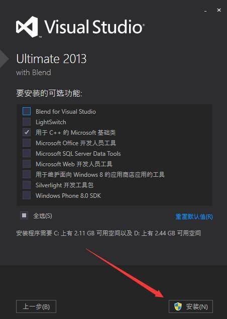 进入到下个页面后,选择自己需要的功能,点击安装即可。安装时间约半小时到一小时,不同的电脑配置不同需要的时间也不同。