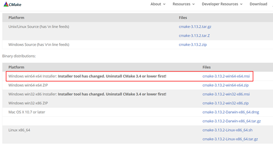 如下图,进入官网,下载红框中的安装文件https://cmake.org/download/