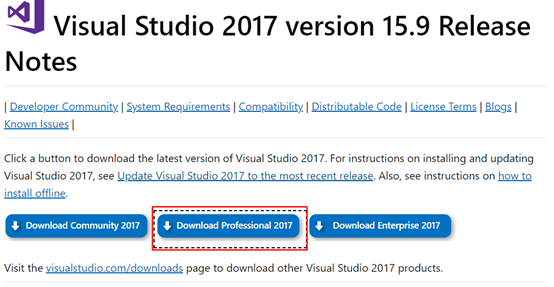 打开如下下载页面,选择红框中的专业版,下载在线安装包https://docs.microsoft.com/en-us/visualstudio/releasenotes/vs2017-relnotes