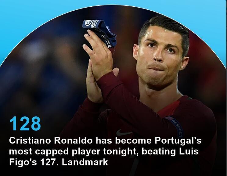在葡萄牙对阵奥地利的比赛中中,C罗首发登场,这样他就以128次为葡萄牙出场的纪录超越127次的菲戈成为葡萄牙历史出场第一人!
