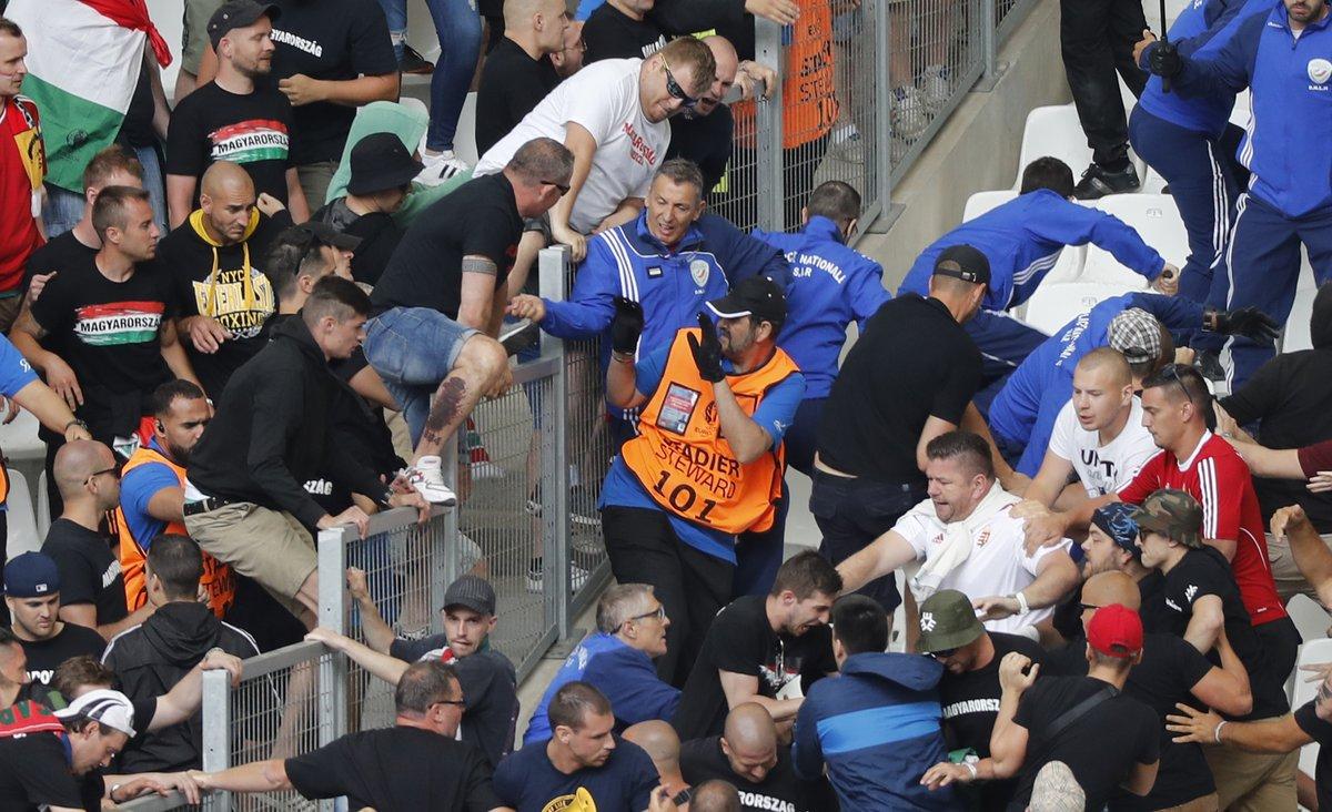冰岛与匈牙利的比赛还没开始,双方球迷就在场内起了冲突,当地警方也已经出动在维持秩序。