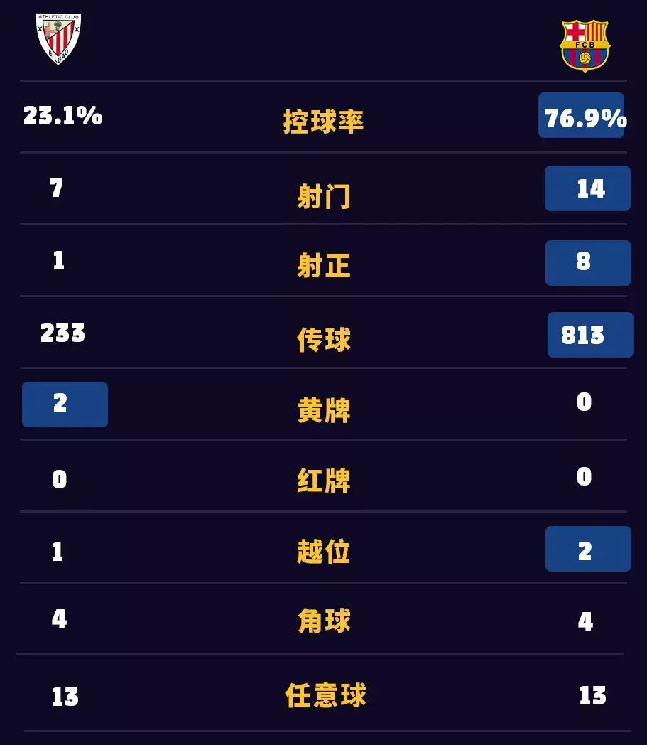 全场比赛结束,最终巴萨在诺坎普球场4-0战胜毕尔巴鄂竞技!迎来哈维执教后的首次三连胜!