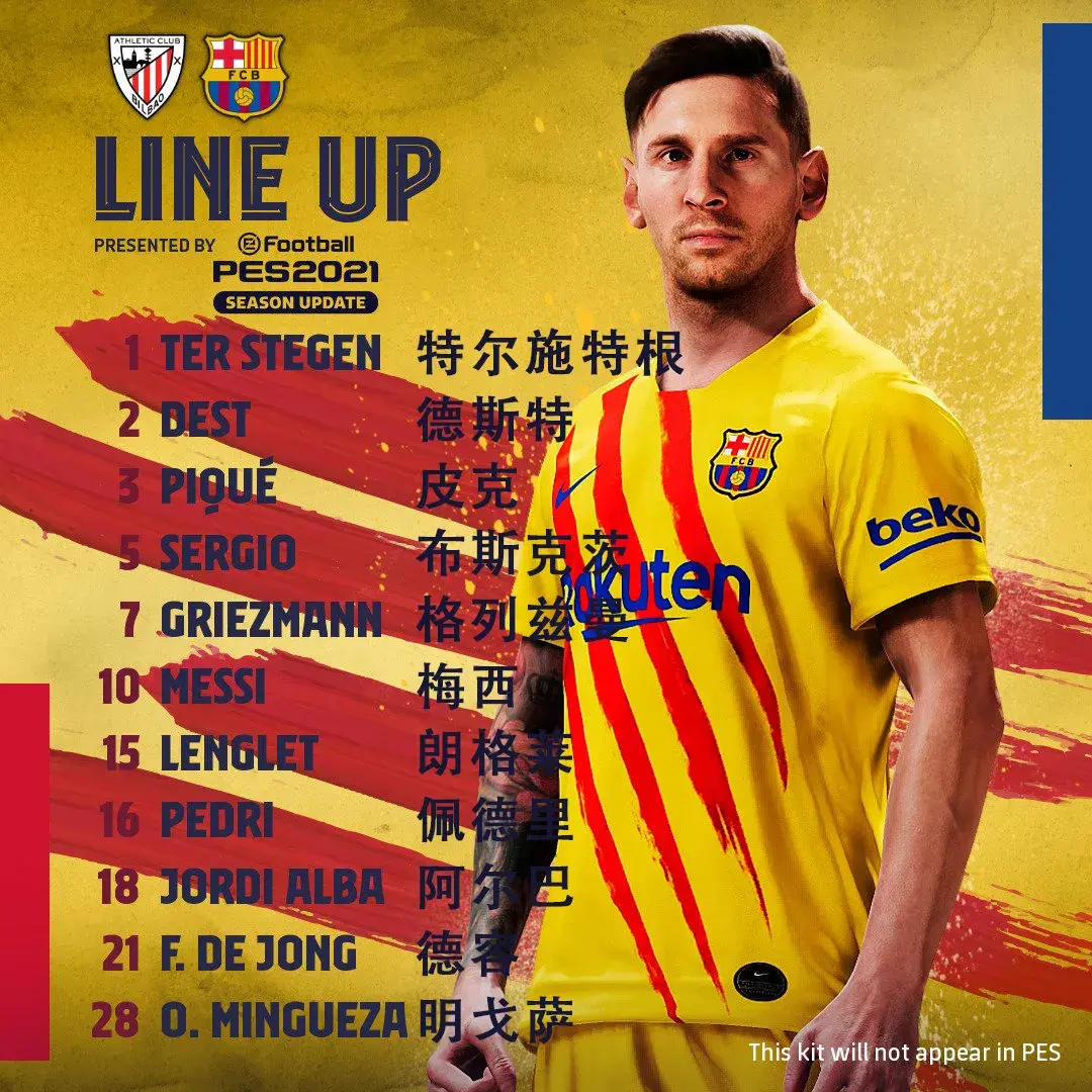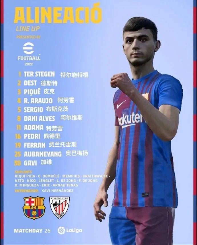 中场:5-布斯克茨,21-德容,16-佩德里(81' 27-莫里巴)