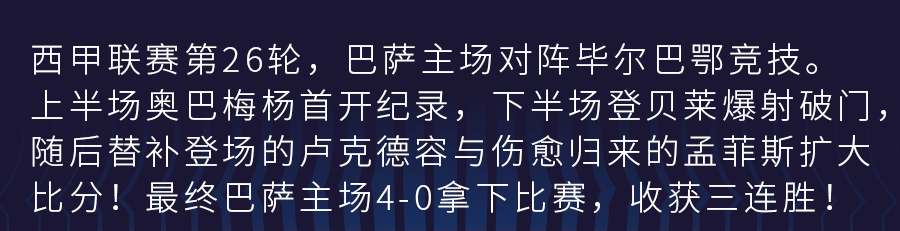 比赛第36分钟,巴萨获得角球机会,皮克头球被挡出,奥巴梅扬补射进球!美羊羊连续三场破门!巴萨1-0毕尔巴鄂竞技!