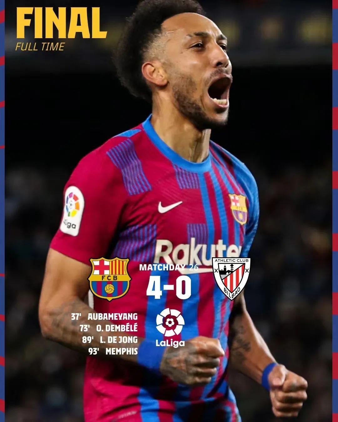 比赛第93分钟,登贝莱送出助攻,伤愈归来的孟菲斯铲射破门!巴萨4-0毕尔巴鄂竞技!