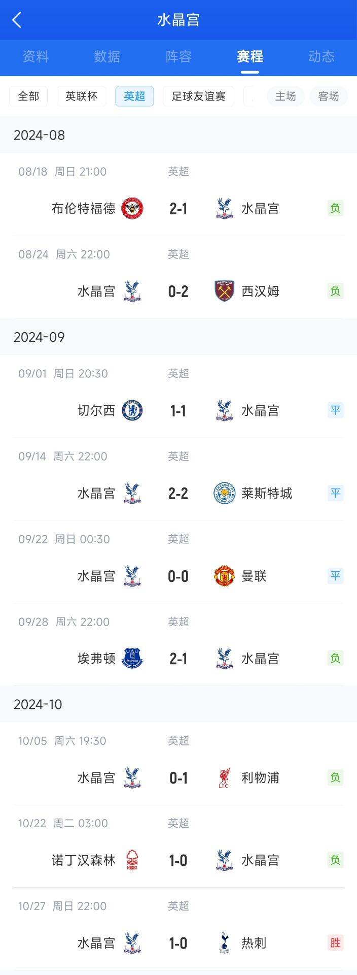 本赛季水晶宫表现糟糕,处在降级区边缘,前9轮比赛只拿了6分。不过有趣的是,水晶宫拿分的对手是热刺,他们赢球拿3分。此外则是平了切尔西、曼联和莱斯特城,在3个曾经的英超冠军身上各拿1分。