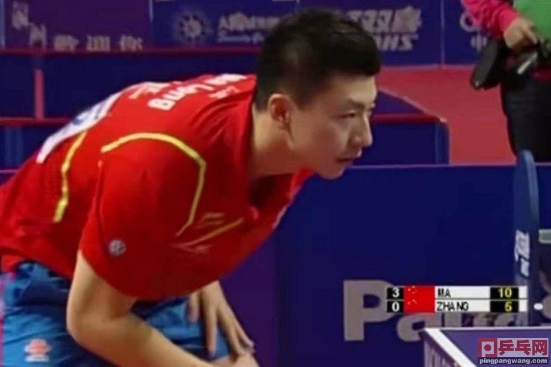 马龙发反手急长下旋球,张继科反手拉球下网,12-10,马龙3-0领先。