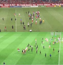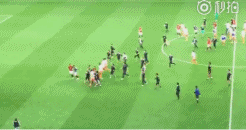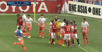 由于场面混乱,两队的多名替补球员、工作人员和现场安保都冲进了球场内,一时间内球场内有数十人之多,此时只见一济州联13号权宇球员从人丛中飞出,全场追打浦和红宝石前锋慎野智章,日本前国脚为了躲避追打,不得不撒开腿跑向入场通道。