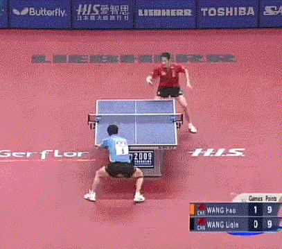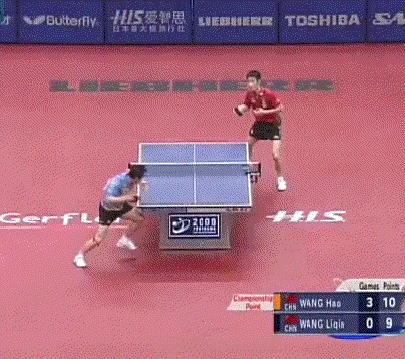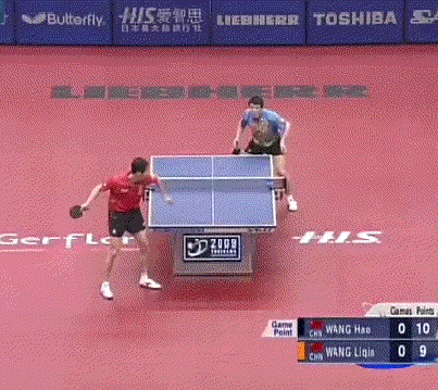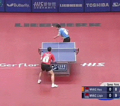 王励勤发球,王皓正手挑直线,王励勤反手拨中路,王皓侧身正手抢冲中路,10-9。