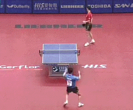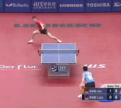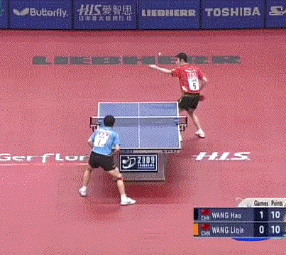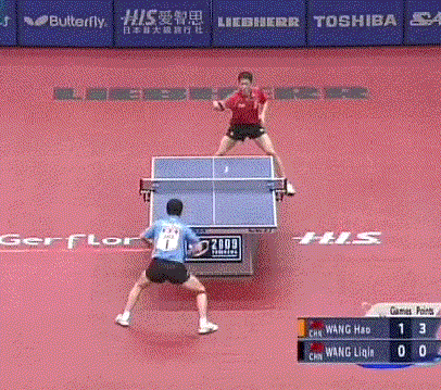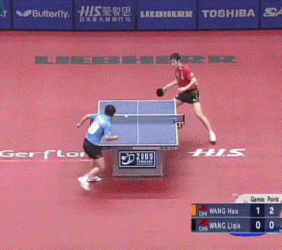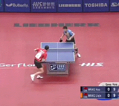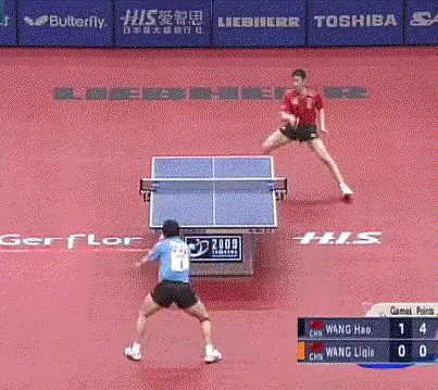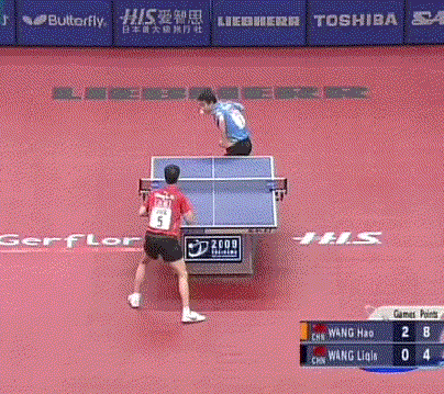 王皓连续两板反手拧拉中路,王励勤先是反手推拨一板,紧接着想用正手反拉,在中路一个小小的范围内要做到正反手转换并不容易,王励勤漏球了。