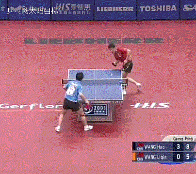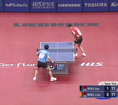 王皓发球,王励勤反手拨球,王皓侧身正手拉中路,王励勤防回,王皓反手拉斜线,13-11拿下。