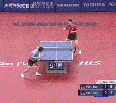 两人正手相持对拉,王皓先拉大斜线,把王励勤逼到右边远台,左边留下巨大空档,王皓再反拉中路,王励勤从右向左移动击球失误。