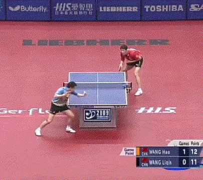 王励勤发球,王皓摆短,王励勤再摆,王皓正手抢冲,12-11。