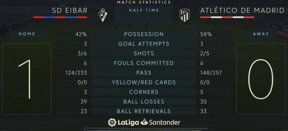 半场战罢,马竞暂0-1埃瓦尔。