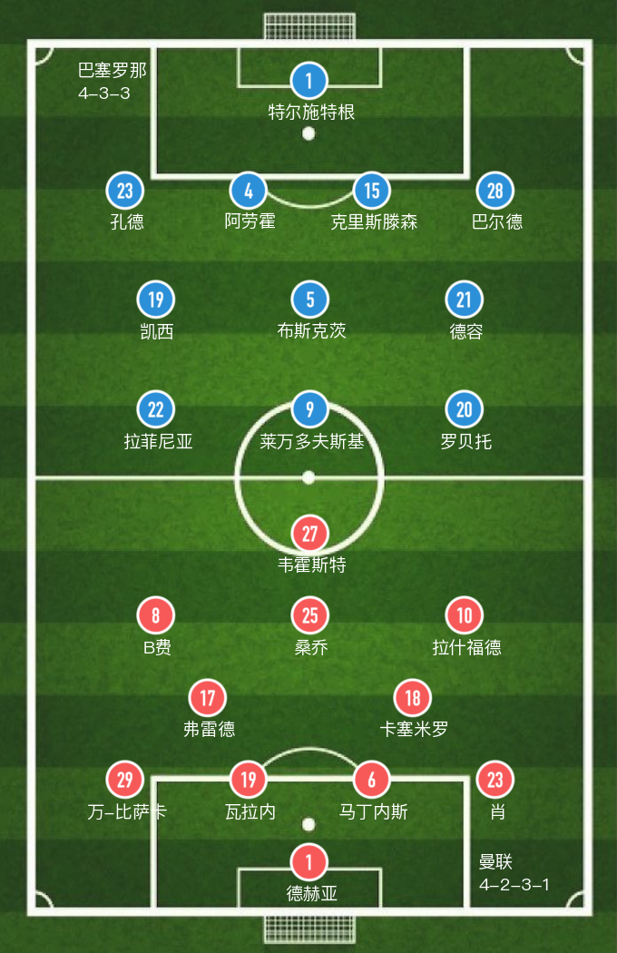 巴塞罗那(4-3-3): 1-特尔施特根,23-孔德,4-阿劳霍(82' 17-阿隆索),15-克里斯滕森,28-巴尔德,19-凯西,5-布斯克茨,21-德容,22-拉菲尼亚(75' 10-法蒂),9-莱万多夫斯基,20-罗贝托(70' 11-托雷斯)