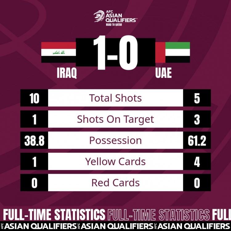 第54分钟,哈里布-苏哈伊尔为阿联酋打破僵局,拿到1-0的领先,此球一进,阿联酋晋级附加赛的希望大增。随着1-0的比分保持到终场,阿联酋最终成功拿到A组第3名,将在亚洲区附加赛面对澳大利亚,韩国队则掉至A组第2,伊朗升至A组头名。