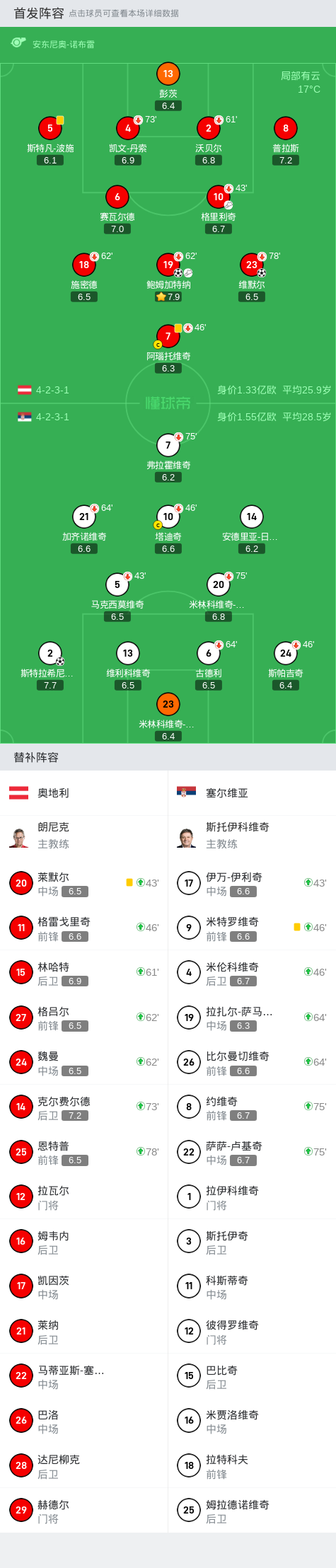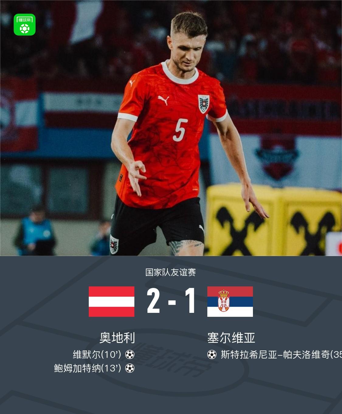 在国家队友谊赛中,奥地利与塞尔维亚展开了激烈的比赛。上半场,鲍姆加特纳直塞,维默尔破门改写比分。格里利奇助攻,鲍姆加特纳破门将比分扩大。维默尔越位在先进球被吹无效,帕夫洛维奇头球补射破门扳回一分。下半场,双方均未创造出好机会,伊万-伊利奇任意球攻门高出。最终奥地利2-1战胜塞尔维亚。